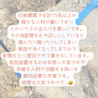 スナップエンドウ栽培植え付け前準備⑦''埋没管設置作業''農園 白柴2023年9月23日読了時間: 1分作付け前に毎回行う埋没管設置作業。疲れるしめんどくさい作業ですが円滑にスナップエンドウ栽培管理や収穫作業を行う上で欠かせない作業です。途中で水漏れすると修理が大変なので壊れないでください🙏